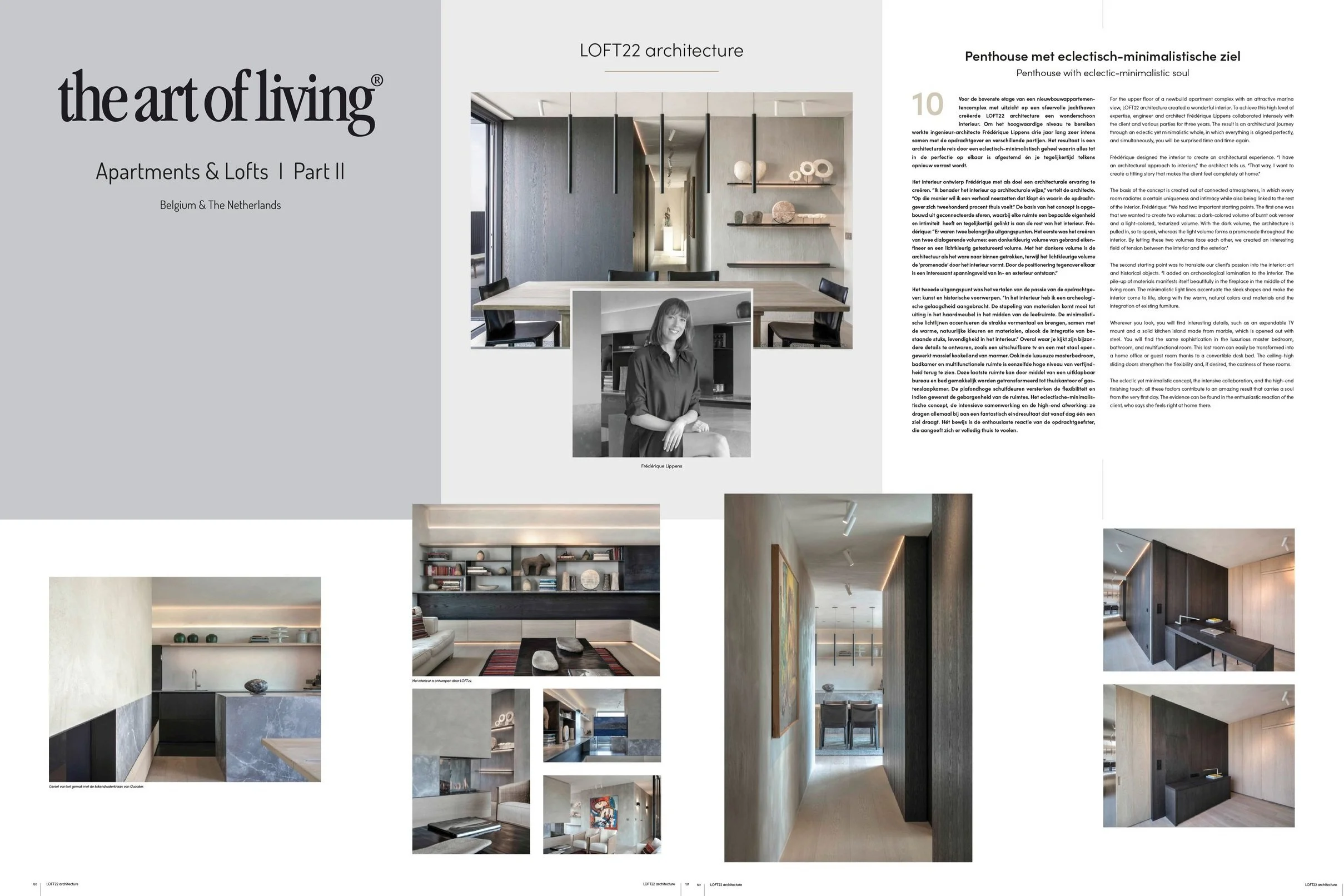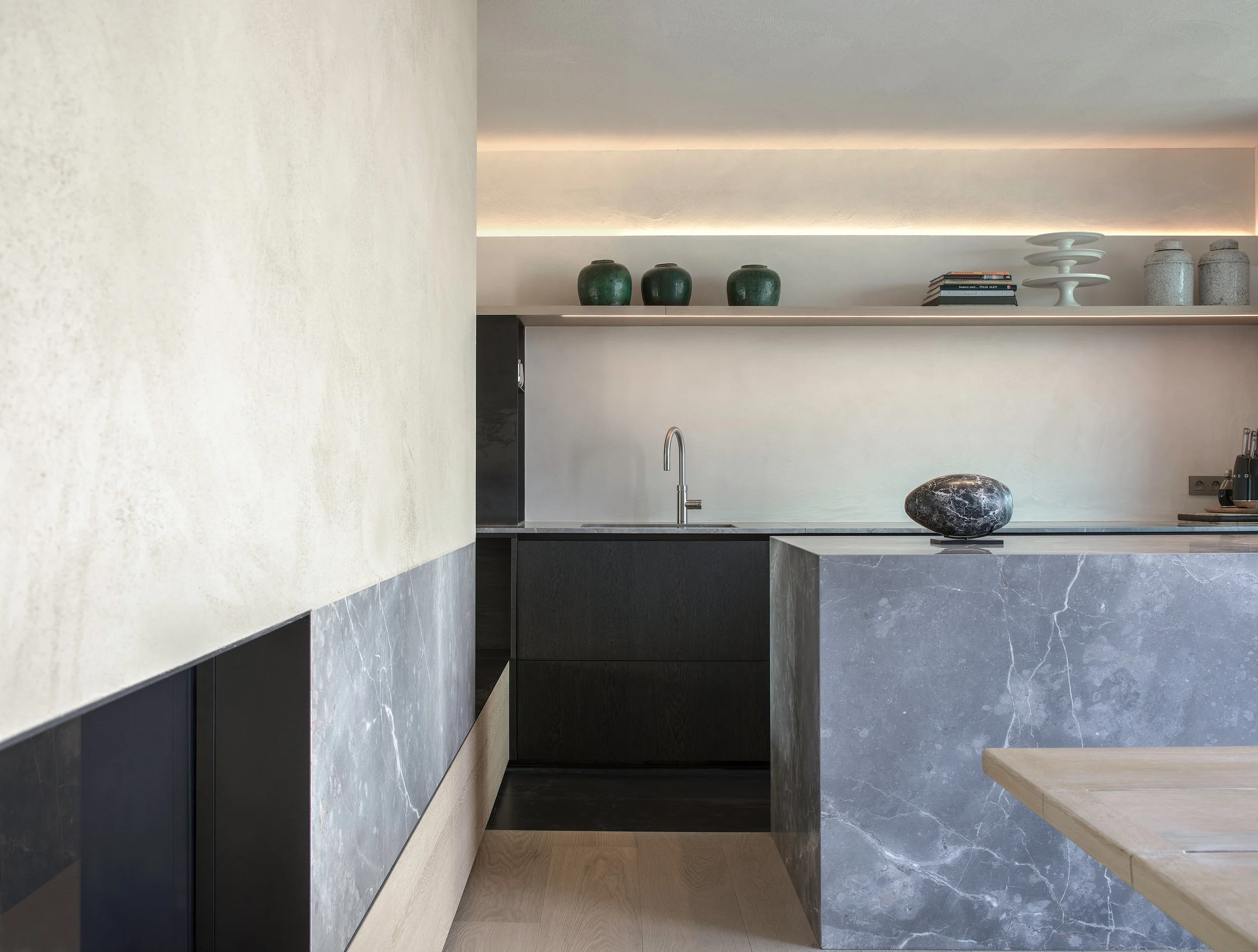 High-end penthouse with views on the marina of Hasselt. An intense collaboration with the client and executors led to a highly detailled result where the owner really feels at home. We approach interior design in an architectural way by creating strong space concepts that are translated into one whole making sense on aesthetic, functional and technical level. Here we wanted to create ‘connected atmospheres’ whereby all the spaces have their own uniqueness and intimacy but are linked thanks to the openness, sight lines and materiality. The sliding doors have a flexible role in this. The first concept is the 2 contrasting volumes - dark wooden volume as an extension of the outside architecture & light textured volume as a guide through the apartment - which are in dialogue with one another. The second is the archeological layeredness that can be found in the living room and which was inspired by the clients’ interest in historical objects. Textures and lighting underline the above and together with the extisting furniture from the clients former country house it forms an eclectic minimalist whole. This project is a nice example of one of our core values not to make new artificial interiors but lively spaces that grow organically. We try to bring together past and present in order to give a soul to our clients projects.